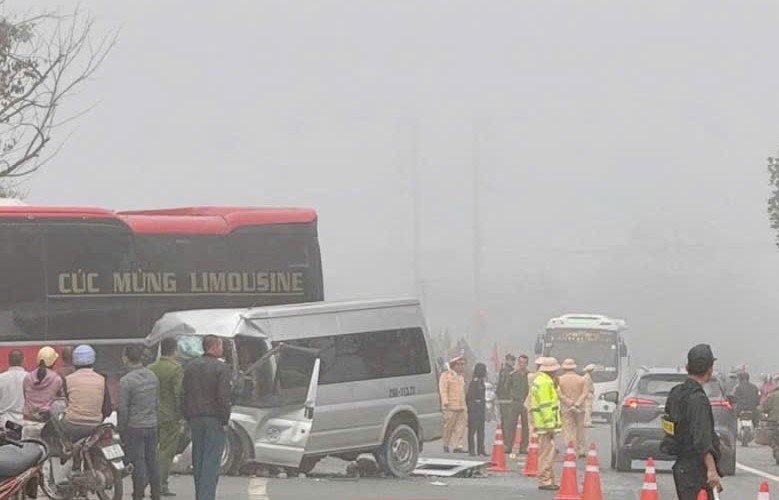 Sau khi va chạm với xe khách giường nằm, xe 16 chỗ dập nát phần đầu. Vụ tai nạn khiến 1 người chết, nhiều người bị thương.