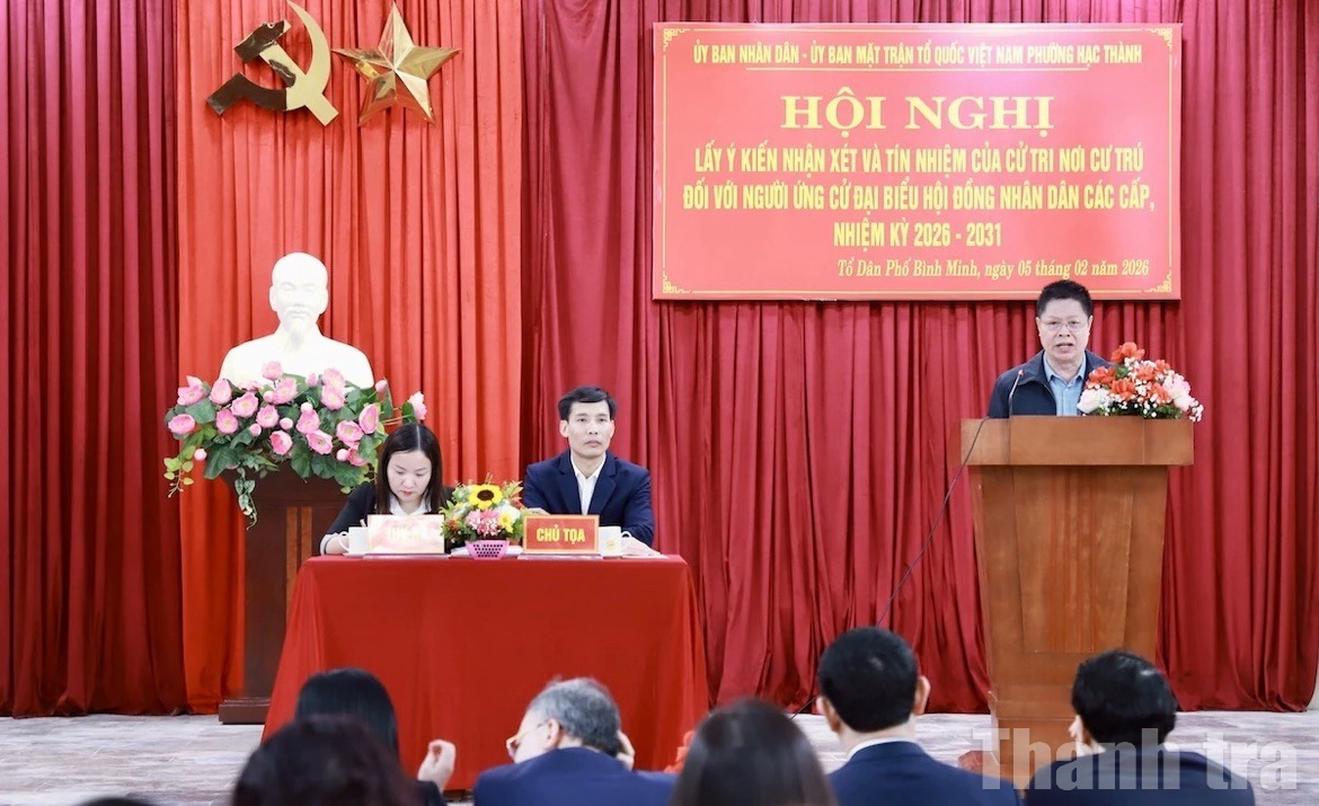Sáng 5/2, tại Tổ dân phố Bình Minh, Ủy ban MTTQ phường Hạc Thành (tỉnh Thanh Hóa) tổ chức hội nghị lấy ý kiến nhận xét và tín nhiệm của cử tri nơi cư trú đối với 22 ng...