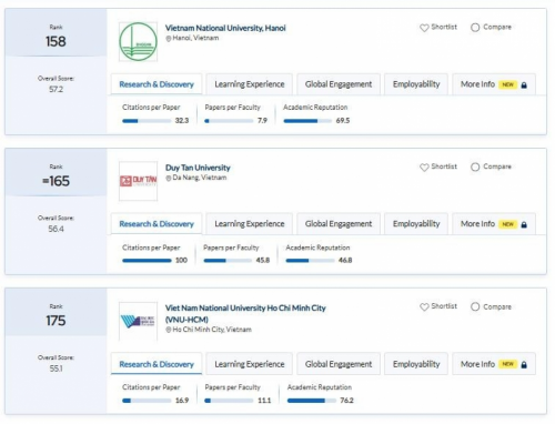 Trong số 25 cơ sở, tổ chức giáo dục lọt top, ĐHQG Hà Nội giữ vị trí cao nhất ở hạng 158, theo sau đó là Đại học Duy Tân với hạng 165, tiếp đó là ĐHQG TP. Hồ Chí Minh với hạng 175. Cả 3 trường này đều đạt tổng điểm đánh giá trên 50 (tính theo thang điểm 100).