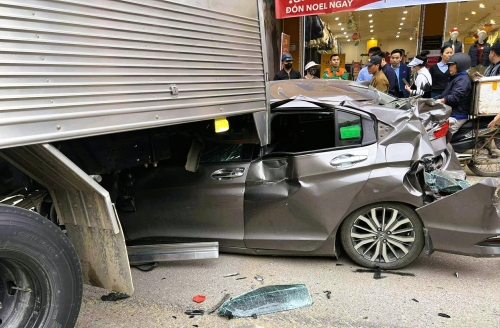 Vụ tai nạn liên hoàn đã khiến 6 ô tô gặp nạn, trong đó xe ô tô con BKS 36A-320.xx bị hư hỏng nặng phần đầu, đuôi và toàn bộ sườn bên lái. Thời điểm gặp nạn, trong xe ô tô con này có 2 người, rất may đều thoát nạn.