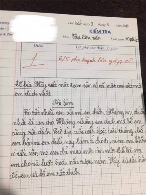 Đáng chú ý, bài văn đầy chân thật này lại khiến cô giáo không hài lòng. Cô chấm bài 1 điểm kèm lời nhận xét: "Ngày 6/5 phụ huynh lên gặp cô". Quyết định này của cô giáo đã làm dấy lên nhiều tranh luận trái chiều trên mạng.
