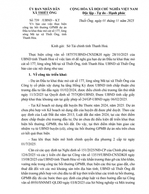 Theo đó, thực hiện Công văn số 18757/UBND-CNXDKH ngày 28/10/2025 của UBND tỉnh Thanh Hóa về việc làm rõ đề nghị gia hạn dự án Đầu tư khai thác mỏ cát số 177, lòng sông Mã tại xã Thiết Ống, tỉnh Thanh Hóa, UBND xã Thiết Ống đã có Văn bản số 739/UBND-KT báo cáo về vấn đề này.