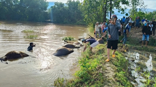 Tuy nhiên, nước đổ về nhanh khiến nhiều hộ dân đang cột trâu ngoài ruộng không kịp di chuyển. Do đó, có 23 con trâu của 7 hộ dân bị chết do ngạt nước.