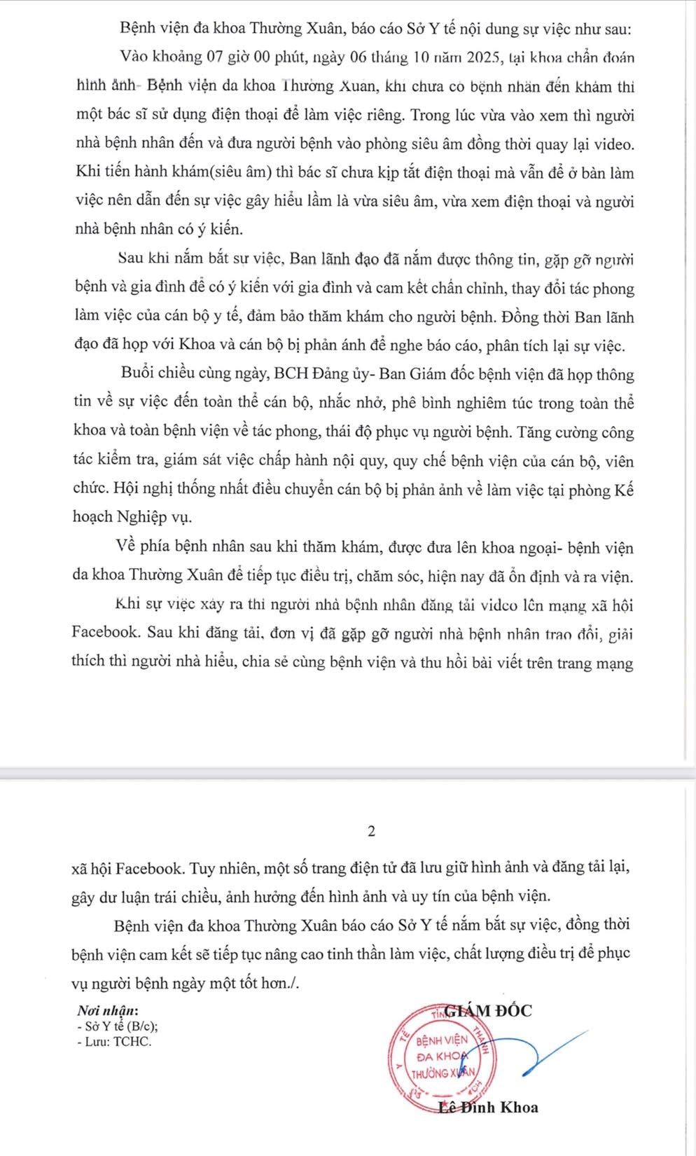 Ngày 9/10, Bệnh viện đa khoa Thường Xuân đã có báo cáo Sở Y tế. Theo đó, vào khoảng 07 giờ 00 phút, ngày 6/10, tại khoa chẩn đoán hình ảnh, Bệnh viện đa khoa Thường Xuân, khi chưa có bệnh nhân đến khám thì một bác sĩ sử dụng điện thoại để làm việc riêng.