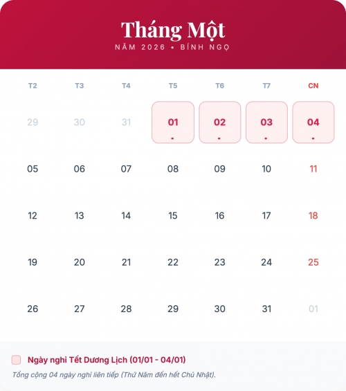 Như vậy, dịp nghỉ Tết Dương lịch năm 2026, công chức, viên chức được nghỉ 4 ngày liên tục từ Thứ năm ngày 1-1-2026 đến hết Chủ nhật ngày 4-1-2026 (làm bù vào Thứ bảy ngày 10-1-2026).