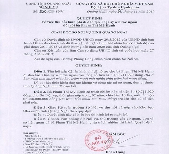 Sở Nội vụ tỉnh Quảng Ngãi quyết định thu hồi gấp hai lần kinh phí đã hỗ trợ đối với bốn trường hợp đi đào tạo thạc sĩ ở nước ngoài, với tổng số tiền hơn 9,8 tỷ đồng.