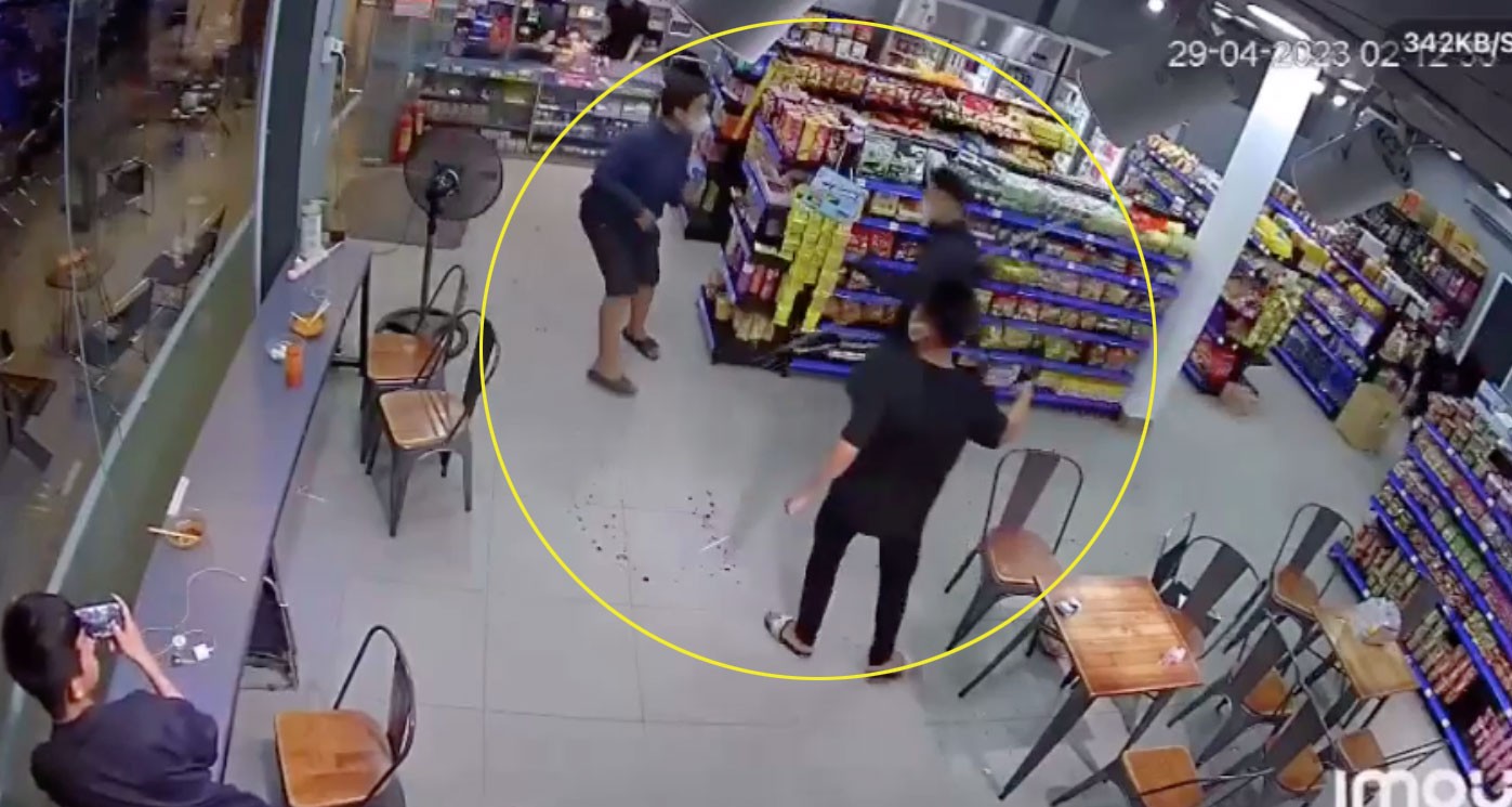 Camera ghi lại cảnh nhóm thanh niên từ đâu xông thẳng vào cửa hàng tiện lợi, tay cầm hung khí miệng hô hoán chém người khiến nhiều khách hàng sợ hãi, la hét.