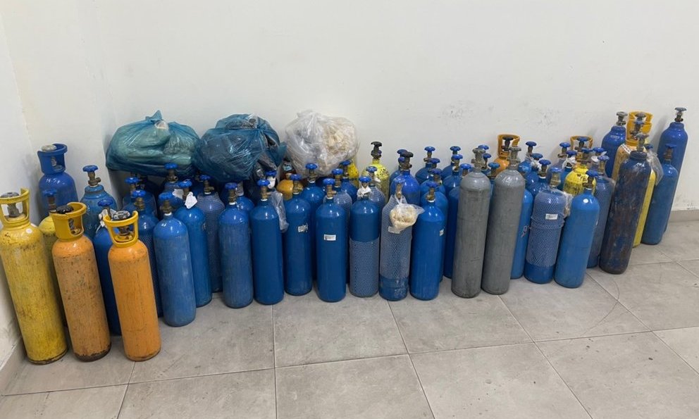 Lực lượng công an Tp.Đà Nẵng phát hiện bên trong một ngôi nhà trên đường 2/9 có chứa 6 bình kim loại khí cười N2O còn nguyên và 1 bình kim loại hết khí.