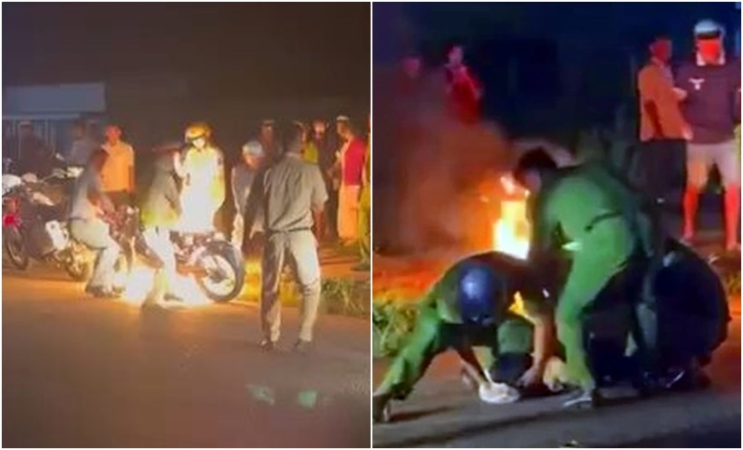 Đối tượng Trần Đức Linh không đội mũ bảo hiểm, đạp ngã xe máy xuống đường và bật lửa đốt xe khi CSGT yêu cầu kiểm tra nồng độ cồn.