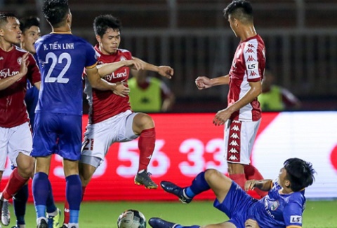 Tiến Linh va chạm với Công Phượng khi bảo vệ đồng đội trong trận CLB Bình Dương thắng CLB TP.HCM 2-1 ở vòng 8 V.League 2020.