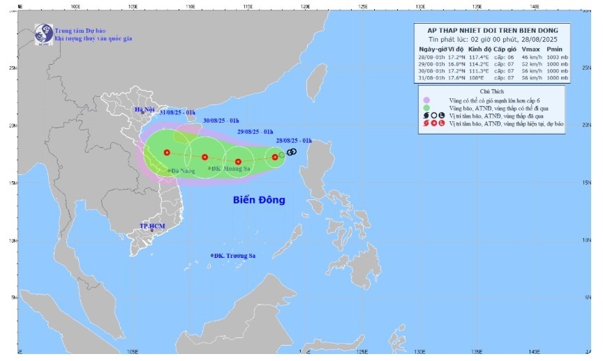 Theo Trung tâm Dự báo Khí tượng Thủy văn quốc gia, hồi 1h ngày 28/8, sức gió mạnh nhất vùng gần tâm áp thấp nhiệt đới mạnh cấp 6 (39-49 km/giờ), giật cấp 8. Di chuyển theo hướng Tây Tây Nam với tốc độ 10-15km/h.