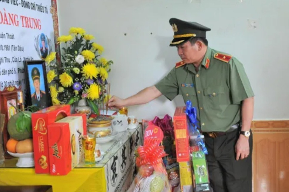 Giám đốc Công an tỉnh Quảng Ninh Đinh Văn Nơi dẫn đầu đoàn lực lượng vũ trang Quảng Ninh thăm hỏi, động viên 6 gia đình liệt sỹ và 2 chiến sỹ.