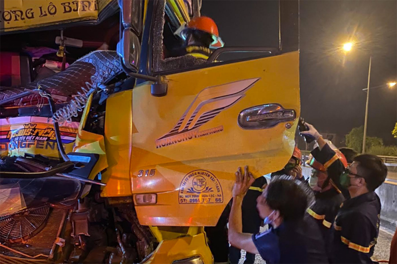 Xe tải BKS 37C. 208.13 và xe container va chạm mạnh khiến cabin xe tải bị biến dạng, tài xế và phụ xe bị mắc kẹt trong cabin không thể thoát ra ngoài.