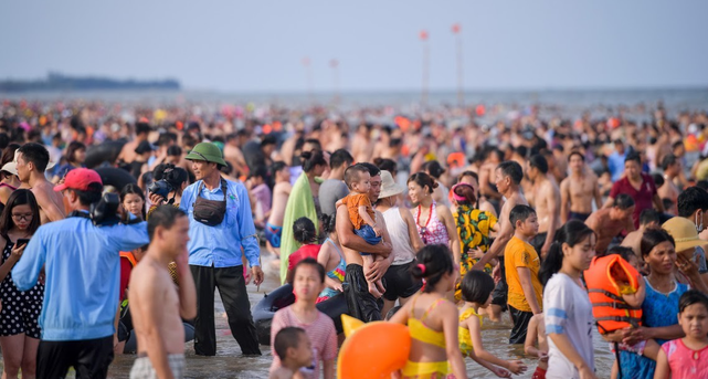 Nắng nóng như chảo lửa, hàng ngàn du khách vẫn chen chúc nhau tắm biển Sầm Sơn