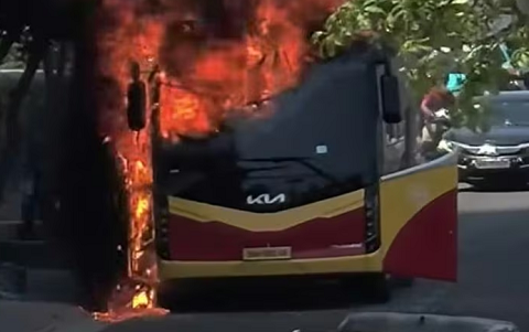 Một xe khách bốc cháy dữ dội, khói đen bốc lên ngùn ngụt sát tòa nhà Mường Thanh Khánh Hòa khiến nhiều người dân hoang mang