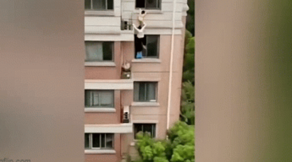 Thót tim xem cảnh giải cứu em bé treo lơ lửng bên ngoài ban công nhà