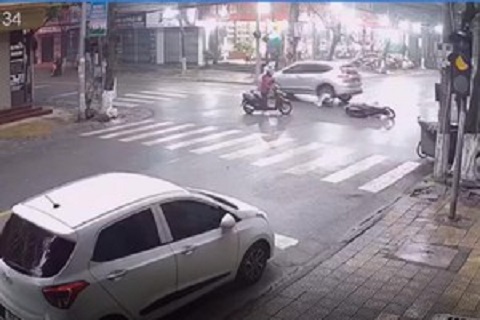 Người phụ nữ điều khiển xe máy chạy với tốc độ cao, bất ngờ phanh gấp rồi lao thẳng vào gầm ô tô ngay giữa ngã tư.
