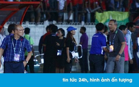 Huấn luyện viên trưởng tuyển Việt Nam không vui, xua tay từ chối thiện chí của ông Antoine Hey bên phía Myanmar sau trận hòa không bàn thắng vào tối 20/11.