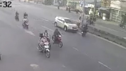 Hai người lái xe máy bị ôtô hất tung lên cao rồi bay qua dải phân cách khi cố đi ngược chiều để sang đường.