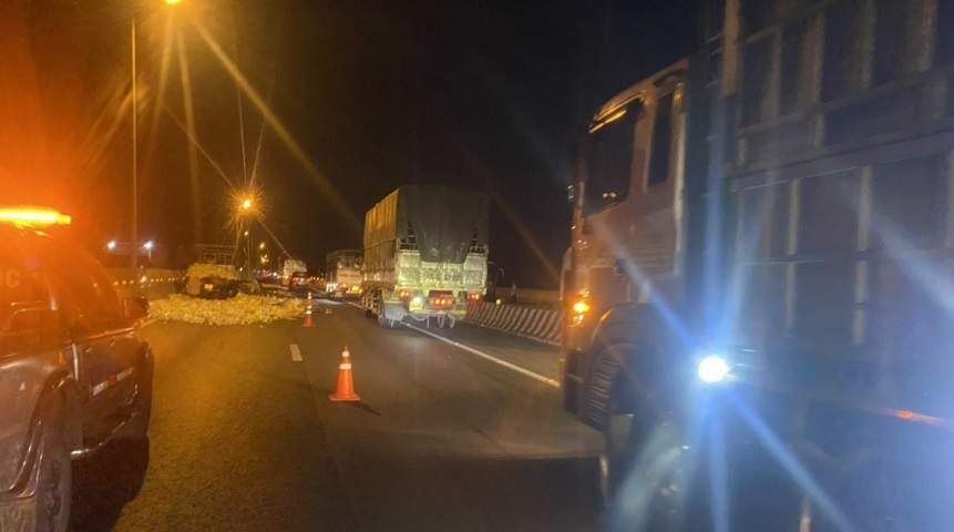 Vụ tai nạn cũng khiến thùng xe tải nứt toác, nhiều hàng hóa trên thùng xe tràn ra mặt đường cao tốc khiến giao thông bị ùn ứ kéo dài hơn 3km.