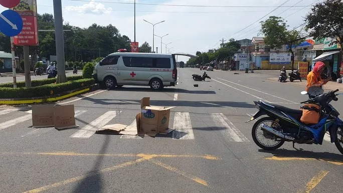 Cú va chạm mạnh khiến hai xe máy bị hất văng xuống đường, người cha chết ngay tại chỗ, 3 người còn lại bị thương đã được đưa đi cấp cứu.