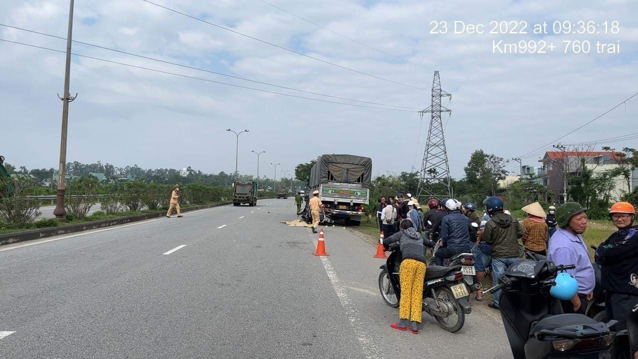 Ô tô tải đang dừng đỗ sát lề quốc lộ 1 qua Quảng Nam thì bất ngờ bị xe máy tông mạnh phía sau. Vụ tai nạn khiến 1 người chết, 1 người bị thương nặng.