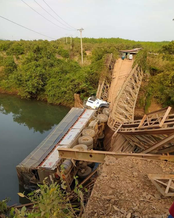 Xe tải chở ống nước vào khu sản xuất của tập đoàn Hoàng Anh Gia Lai đã làm sập cầu sắt bắc qua suối chỉ vì tài xế đi lạc đường.