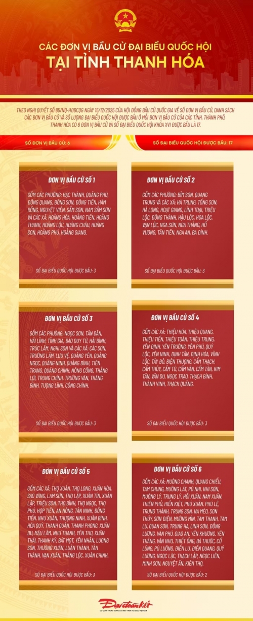 Theo Nghị quyết số 85/NQ-HĐBCQG ngày 15/12/2025 của Hội đồng Bầu cử quốc gia về số đơn vị bầu cử, danh sách các đơn vị bầu cử và số lượng đại biểu Quốc hội được bầu ở mỗi đơn vị bầu cử của các tỉnh, thành phố, Thanh Hóa có 6 đơn vị bầu cử và số đại biểu Quốc hội khóa XVI được bầu là 17.