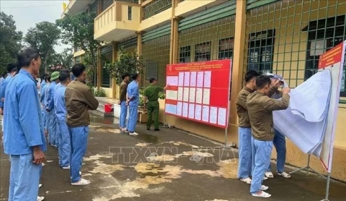 Dù môi trường quản lý nghiêm ngặt, các học viên tại Trại tạm giam, Công an tỉnh Thanh Hóa vẫn được pháp luật bảo đảm đầy đủ quyền công dân, trong đó có quyền bầu cử - một quyền hiến định quan trọng. Ảnh: TTXVN phát |