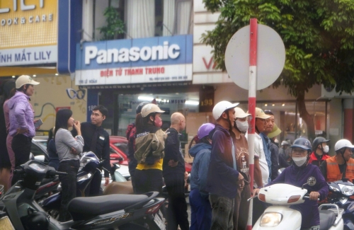 | Rất đông người dân đứng trên phố Lê Hoàn xem lực lượng công an làm nhiệm vụ. |