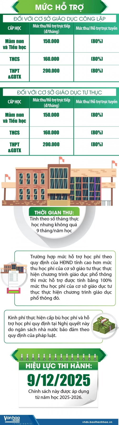 HĐND tỉnh Thanh Hóa vừa ban hành Nghị quyết số 60/2025/NQ-HĐND quy định mức học phí đối với các cơ sở giáo dục mầm non, giáo dục phổ thông công lập và mức hỗ trợ học phí đối với trẻ em, học sinh học tại các cơ sở giáo dục mầm non dân lập, tư thục, cơ sở giáo dục phổ thông tư thục, cơ sở giáo dục tư thục thực hiện chương trình giáo dục phổ thông trên địa bàn tỉnh Thanh Hóa từ năm học 2025-2026. Cụ thể như sau: