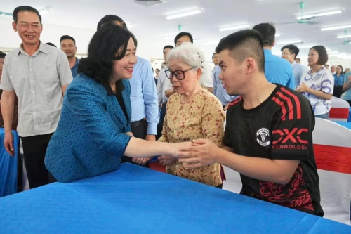 Chủ tịch UBTƯ MTTQ Việt Nam Bùi Thị Minh Hoài ân cần thăm hỏi các đối tượng chính sách tại buổi trao quà. Ảnh: Nguyễn Chung |