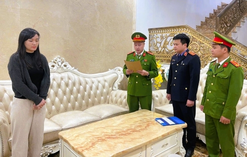 Cơ quan Cảnh sát điều tra Công an tỉnh Thanh Hóa tống đạt quyết định khởi tố, bắt tạm giam đối với bà Lê Thị Thu Hương. Ảnh: Công an Thanh Hóa |