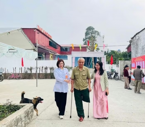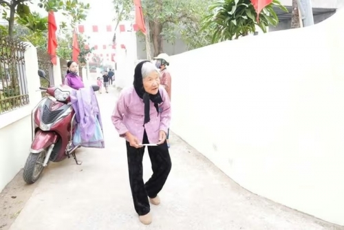 Cử tri xã Hoằng Tiến chống nạng di chuyển đến điểm bầu cử |