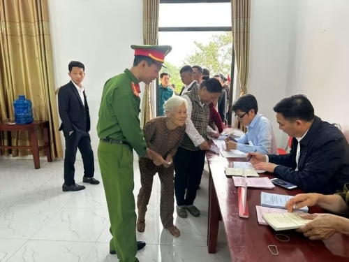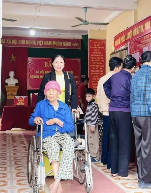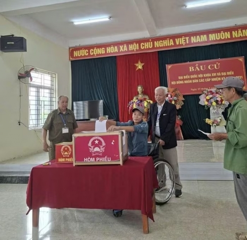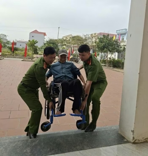 Công an xã Hoằng Tiến hỗ trợ cử tri ngồi xe lăn đến điểm bầu cử |