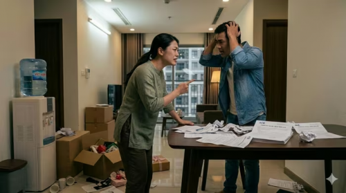 Chỉ khi về chung một nhà, Mai mới phát hiện ra những tin nhắn đòi nợ và những lời xì xào từ họ hàng. Trong số 500 triệu đó, có 150 triệu vay người ngoài và 350 triệu là nợ người thân. Huy từ chối đề nghị bán nhà của bố mẹ để trả nợ, thay vào đó, anh tuyên bố sẽ "để chúng con tự giải quyết". Cái danh xưng "chúng con" ấy bỗng chốc trở thành gông cùm thắt chặt cuộc sống của Mai.