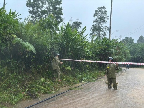 Lực lượng An ninh cơ sở xã Trà Leng chốt chặn các đoạn đường bị sạt lở. |