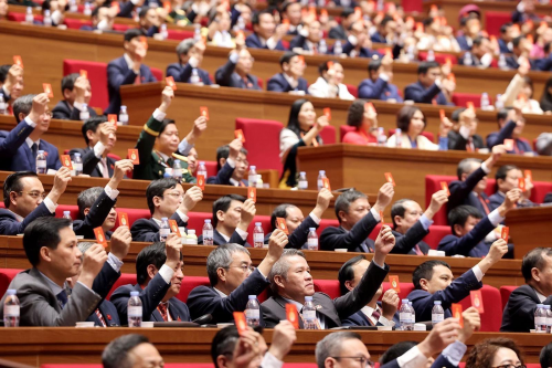 Đại hội XIV của Đảng đã bỏ phiếu thông qua chương trình Đại hội điều chỉnh, rút ngắn 1,5 ngày so với dự kiến ban đầu. Ảnh: TTXVN |