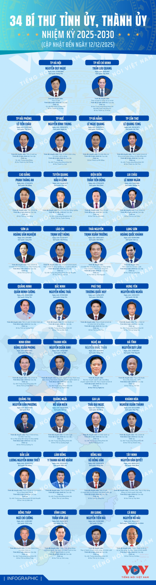 Toàn bộ 34 bí thư tỉnh, thành ủy nhiệm kỳ 2025-2030 đã được kiện toàn và đều không phải là người địa phương.