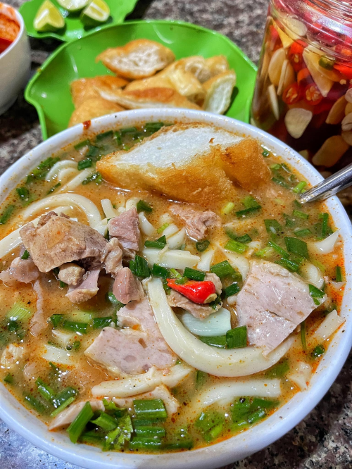 Mới đầu, nhiều du khách nghĩ cháo canh là… cháo. Nhưng khi bát cháo canh nóng hổi được bưng ra, ai cũng bất ngờ bởi đó là sự hòa quyện giữa sợi bánh canh mềm dai và nước dùng sánh nhẹ, không quá loãng cũng chẳng quá đặc. Sợi cháo canh thường được làm thủ công từ bột mì hoặc bột gạo, cắt không đều tay nhưng lại tạo nên cảm giác rất “nhà”, rất thật.