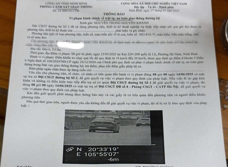 Một chiếc mang nhãn hiệu Kia vi phạm lỗi vượt quá tốc độ cho phép lúc 8h42 ngày 23-5 tại quốc lộ 1 đoạn qua phường Hà Nam, tỉnh Ninh Bình.
