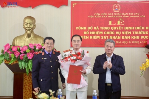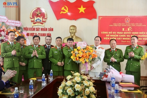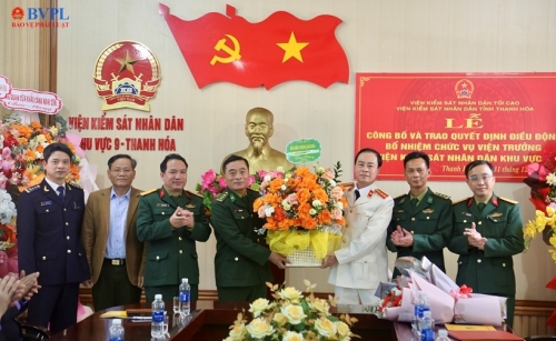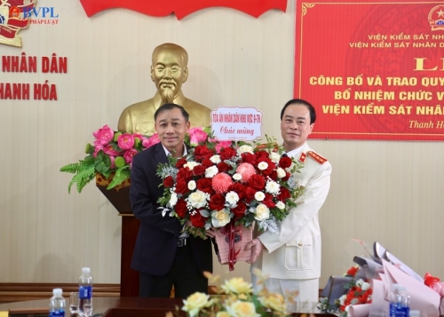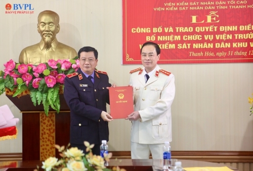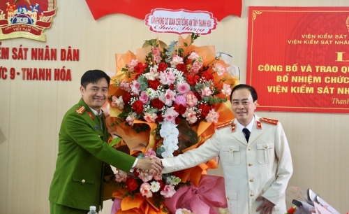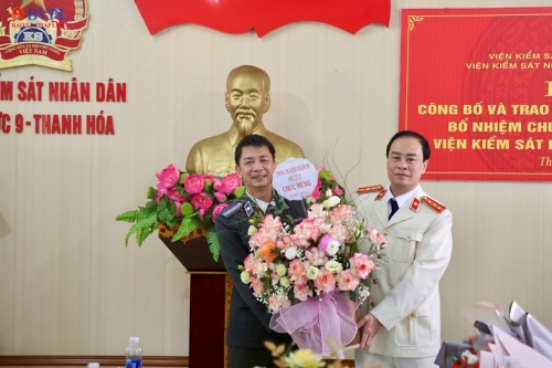 Đồng chí Trần Thế Kính, Tỉnh ủy viên, Bí thư Đảng ủy, Viện trưởng VKSND tỉnh Thanh Hóa trao Quyết định bổ nhiệm đồng chí Đặng Anh Chiến giữ chức vụ Viện trưởng VKSND khu vực 9. |