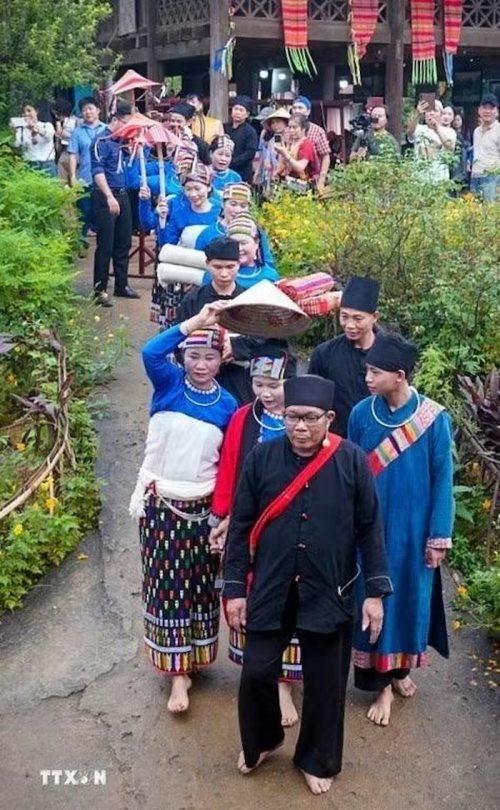 Đi đầu đoàn nhà trai là ông Mơ, tay nâng mâm trầu cau - sính lễ thiêng liêng mở đầu cho câu chuyện trăm năm, theo sau là chú rể cùng gia đình mang theo lễ vật sang nhà gái xin cưới. (Ảnh: Khánh Hòa/TTXVN) |
