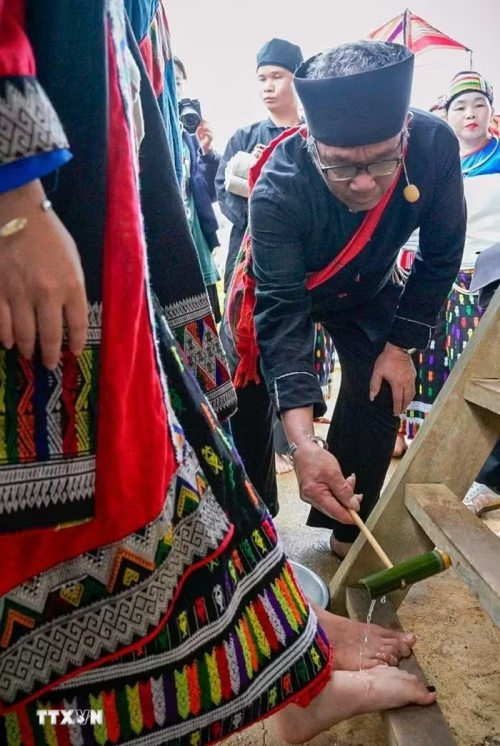 Trong lễ cưới hai, quan trọng nhất là tục rửa chân cho cô dâu khi bước vào nhà chồng, mang ý nghĩa gột sạch những bụi trần trước đây, bước vào cuộc sống mới bên nhà chồng, chăm lo làm ăn, hướng đến một gia đình hạnh phúc. (Ảnh: Khánh Hòa/TTXVN) |