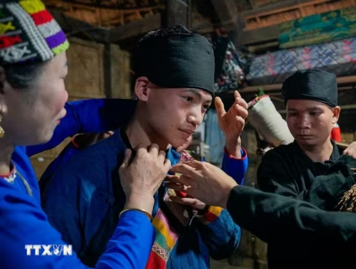 Trang phục cưới của chú rể được họ nhà trai chuẩn bị chu đáo và cẩn thận. (Ảnh: Khánh Hòa/TTXVN) |