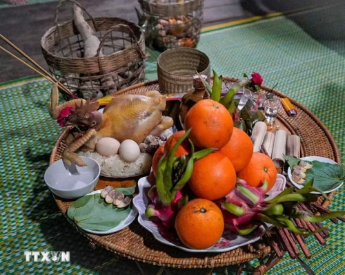 Mâm lễ cúng được gia đình nhà trai chuẩn bị chu đáo. (Ảnh: Khánh Hòa/TTXVN) |