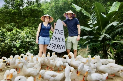 Khách du lịch nước ngoài thích thú những đàn vịt ở các điểm du lịch cộng đồng của Bồng Lai. |