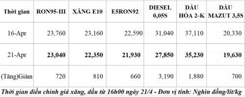 Giá dầu diesel 0.05S từ 16h00 ngày 21/4 giảm sâu 3.190 đồng/lít, giá bán mới là 27.850 đồng/lít; Dầu hỏa giảm 1.880 đồng/lít, giá bán là 35.230 đồng/lít; Giá dầu mazut 180CST 3.5S kỳ này giảm 700 đồng/lít, giá bán mới là 19.630 đồng/kg.