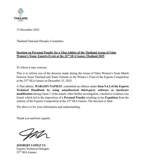 Theo thông báo chính thức được phát đi từ Ủy ban Olympic Thái Lan, vận động viên Naphat Warasin (biệt danh Tokyogurl) thuộc đội tuyển Liên Quân Mobile nữ nước này đã chính thức bị truất quyền thi đấu và gạch tên khỏi toàn bộ kỳ đại hội. Quyết định kỷ luật nêu rõ nữ tuyển thủ này đã vi phạm nghiêm trọng Điều 9.4.3 của Sổ tay Kỹ thuật Thể thao điện tử khi cố tình sử dụng phần mềm hoặc can thiệp phần cứng bên thứ ba không được phép để tạo lợi thế trong Ván 1 của trận đấu quan trọng với tuyển Việt Nam.