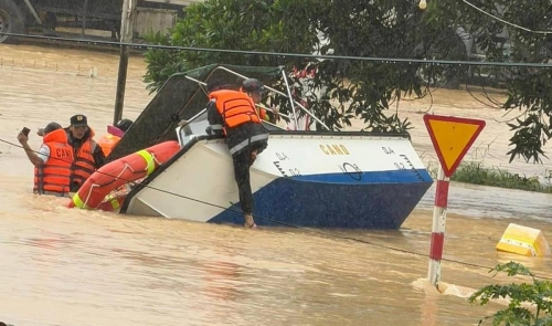 | Một cano làm nhiệm vụ cứu trợ bị lật khi trúng dòng nước xiết tại Phường Điện Bàn Đông. |